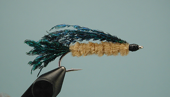 Wing: 4-6 Strands Peacock Herl over Violet Bucktail over White Bucktail