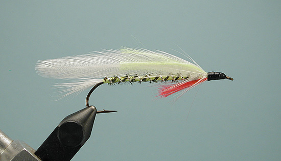 Wings: White Bucktail, under Chartreuse Goat, Crystal Rainbow, Under Fluorescent Pink Bucktail, under 6 Strands Peacock Herl